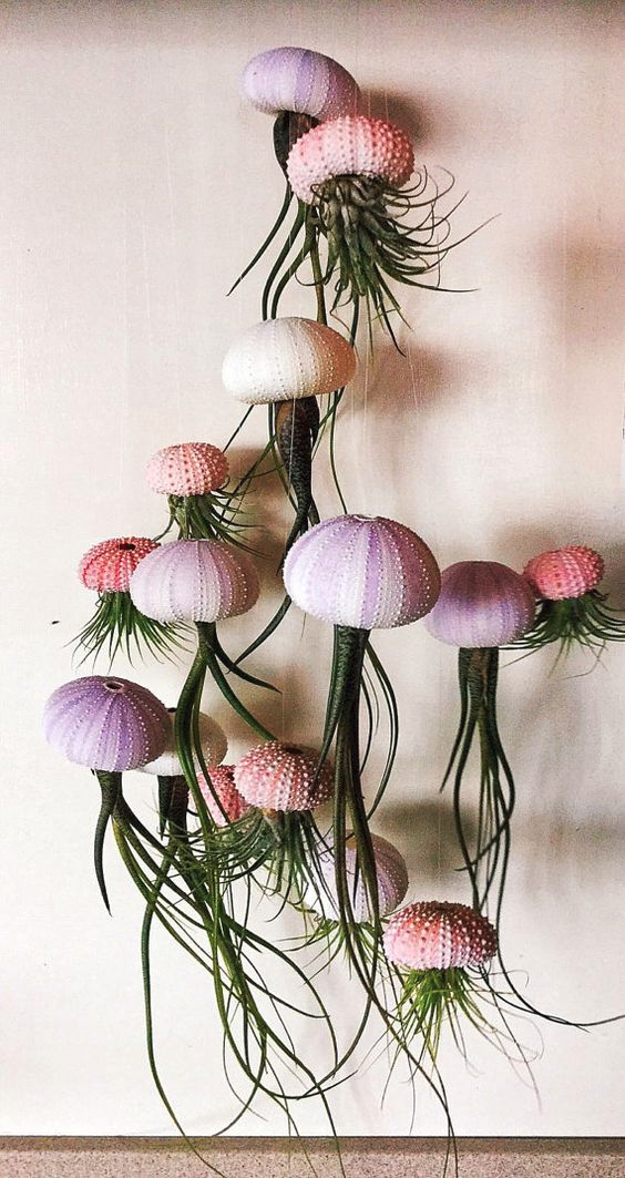 Поместив росток атмосферной тилландсии в раковину моллюска, за несколько минут мы получим неповторимую композицию для любой части квартиры или дома. Такой импровизированный «горшок» без почвы будет уместен в гостиной, кухне и даже детской комнате.
