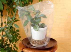 - чтобы летом вашим цветам было комфортно во время вашего отсутствия, устройте над ними колпак из прозрачной пленки, тем самыми вы создадите эффект маленькой теплички. Однако, решив воспользоваться этим методом, имейте в виду, что в этом случае растения окажутся в несколько стрессовых условиях. Поэтому, если вы будете отсутствовать в течение как минимум недели, то рекомендуется заготовить черенки ваших любимцев и поместите их в банку с водой.