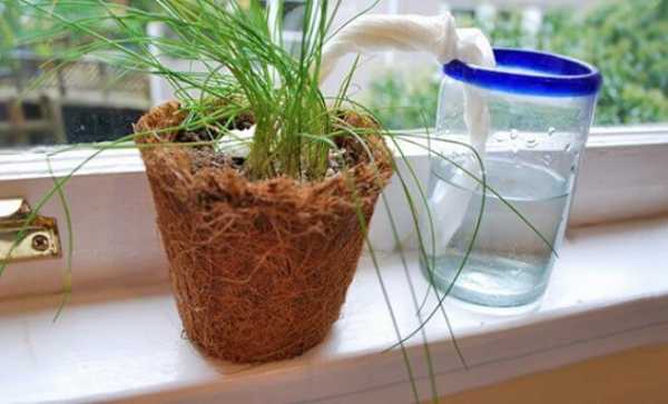 Чтоб фитиль прочно держался, его закрепляют в кадке шпилькой или колышком. Самым надёжным вариантом присоединения шнурка к горшку будет, если продеть его в отверстие в донышке горшка перед посадкой растения. Если вас часто не бывает дома, то можно оборудовать такую систему и подсоединить к ней цветочные кадки для обеспечения регулярного полива. Не забывайте только вовремя пополнять ёмкость водой.
