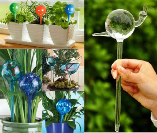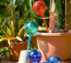 Ярким и оригинальным способом орошать почву в цветочном горшке придумали отечественные производители: цветные пластиковые колбочки, которые наполняются водой, втыкают тонкой ножкой в грунт. Когда в земле становится меньше влаги, в ножку попадает кислород, он выталкивает из колбы то количество воды, которое нужно для корней. Этот метод хорошо подходит для домашних растений, садовых, тепличных и т. д. Он имеет ряд преимуществ: удобство в использовании, не нужно сооружать сложную громоздкую конструкцию, хорошо вписывается в интерьер.