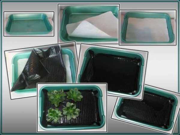 В системе автополива используют два поддона. Внутрь емкости большего размера наливают воды. Далее, погружается поддон меньших габаритов с перфорированным дном. Дно второй емкости застилают ковриком, сверху которого располагают растения.