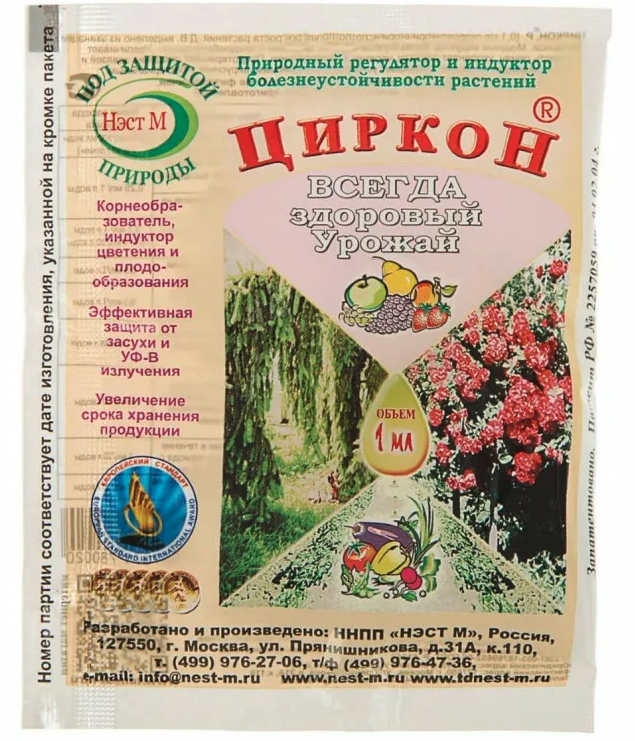 Циркон – это препарат универсального действия, регулирующий рост растений, корнеобразование, цветение и плодоношение. Он относится к фитогормонам, оказывает комплексное действие на растения, активизируя их рост, корнеобразование, повышает устойчивость к воздействию негативных факторов окружающей среды, сопротивляемость заболеваниям. Его использование рекомендовано на протяжении всего периода жизненного цикла растений.
