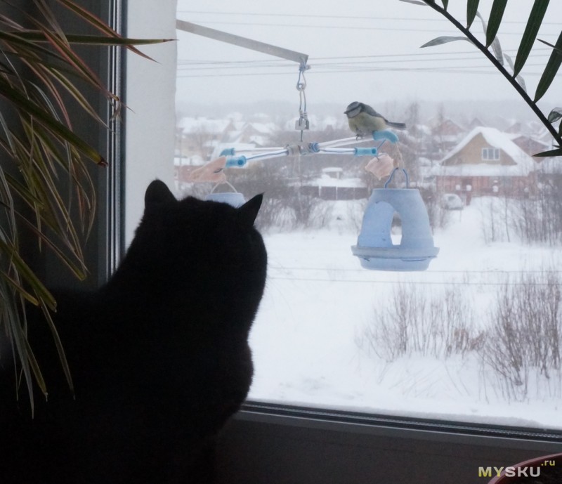 Собрал новую кормушку для птиц из "набора водопроводчика" более ни на что не пригодившегося.Теперь кот занят. Хотя недоступные птицы быстро надоедают )))