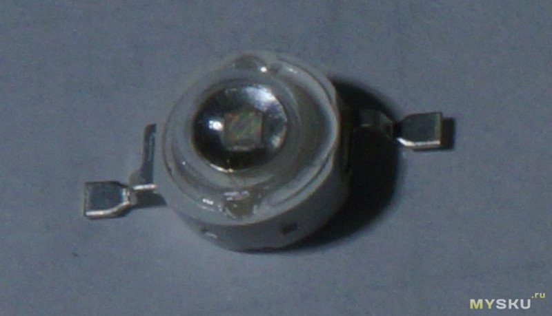 Люминофора у монохромных светодиодов нет, линзы прозрачные и кристаллы видны. У синего (слева) кристалл чуть больше чем у красного (справа), что соответствует описанию.