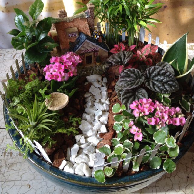 Гармоничней всего в домашнем садике смотрятся суккуленты, фиалки, комнатные розы и другие миниатюрные цветы.