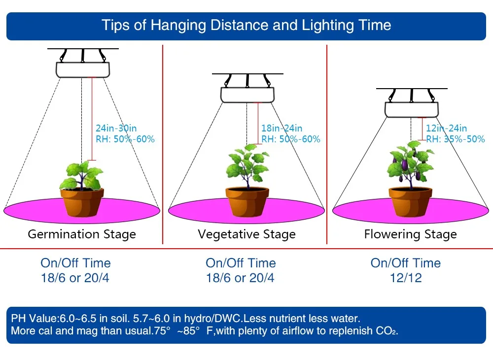 По мере роста растений нужно регулировать спектр, мощность и высоту, на которой фитолампа расположена над культурами.