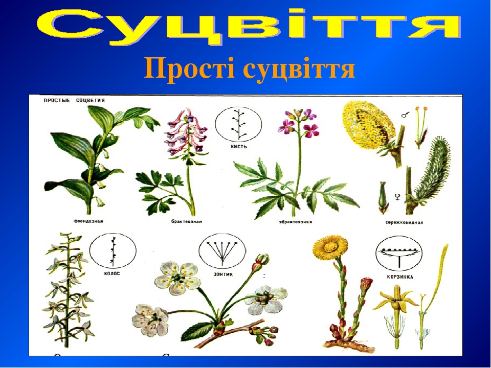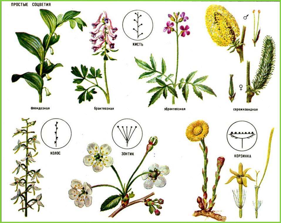 Соцветия бывают простыми и сложными. В простых соцветиях цветки прикрепляются непосредственно к главной оси, а в сложных соцветиях цветки прикрепляются не к главной оси, а к ее разветвлениям, т.е. к оси второго порядка и т.д. Простыми соцветиями являются кисть, зонтик, початок, головка, колос, корзинка, щиток.