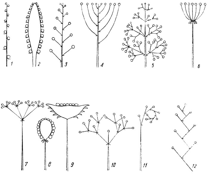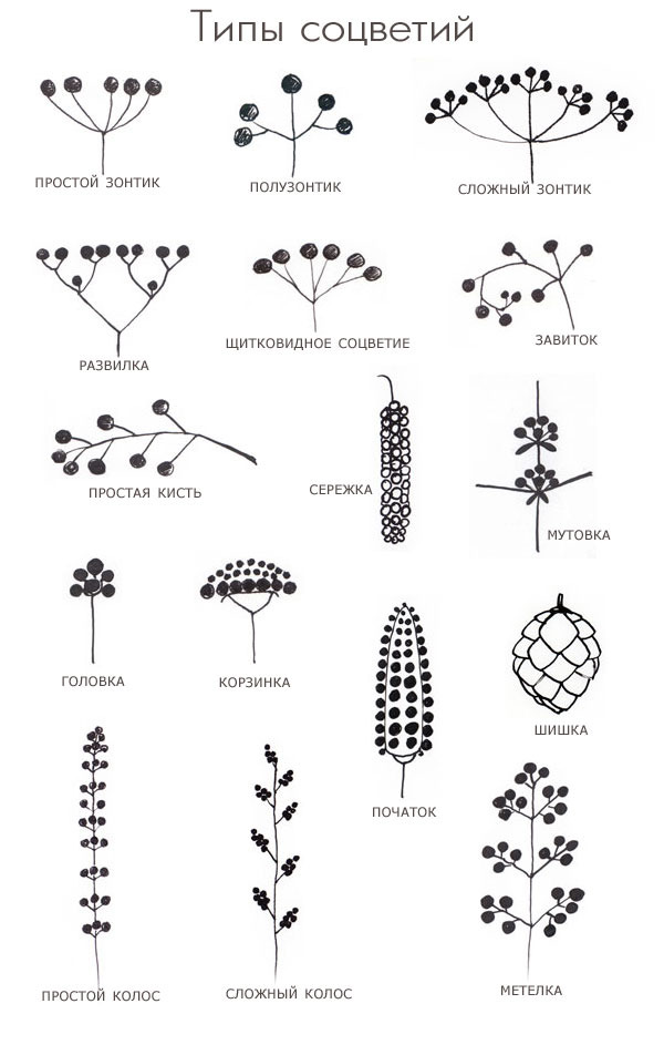 Сложные соцветия – сложная кисть, или метелка, сложный колос, сложный зонтик, сложный щиток.![]()