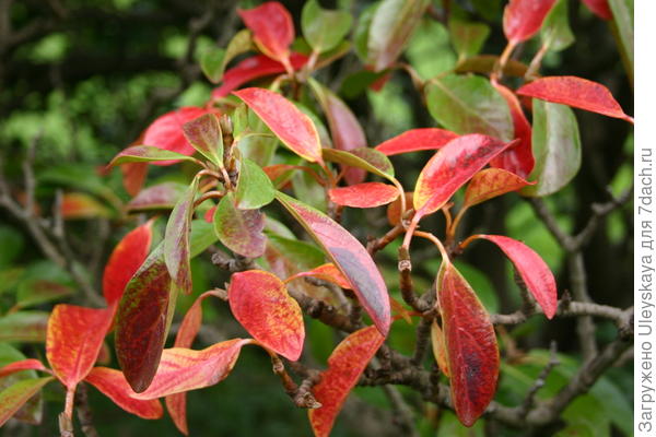 Чудесное перевоплощение осенью происходит и с этим сильноветвистым кустарником со светло-серой корой.