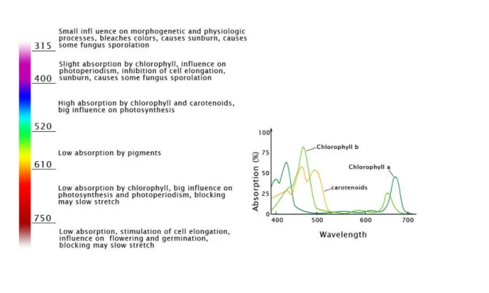 Чтобы происходил фотосинтез и хлорофилл поглощал максимальное количество света для роста растений, растения наиболее эффективно используют как синий , так и красный свет. Другие спектры света, такие как зеленый/желтый/оранжевый, менее полезны для фотосинтеза из-за количества хлорофилла b, поглощает в основном синий свет, а хлорофилл а, поглощает в основном красный и синий свет.