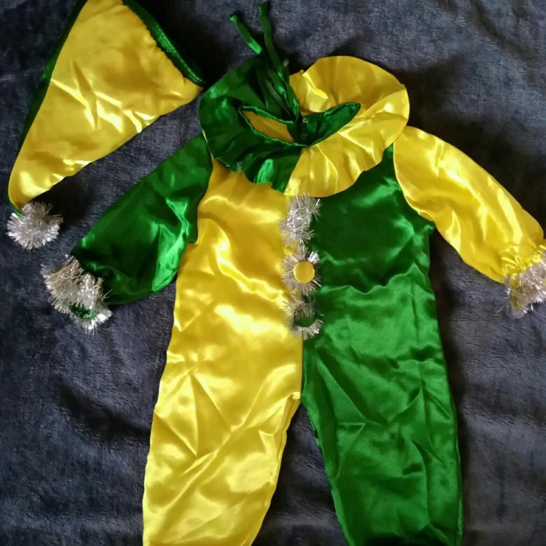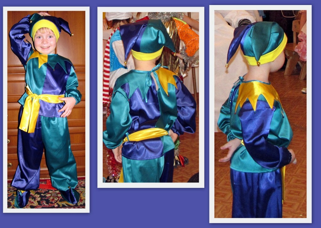 Детский костюм Петрушки предполагает штаны особого фасона – широкие, заправляемые в сапожки, сшитые из материала двух контрастных цветов: жёлтого и синего, зелёного и красного и т.д.