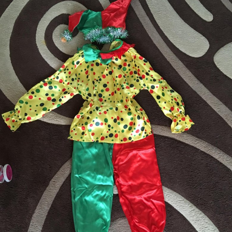 Костюм Петрушки может быть как с колпаком одинарным, так и с двухрожковым. Первый делается из гибкого картона и раскрашивается в тон одежде. Или же обтягивается тканью, а на неё наклеиваются разноцветные круги, лоскутки и т.д. Обязательно украсьте шапку конфетти! Ведь это наряд для праздника! Конус шапочки заканчивается колокольчиком (можно купить в магазине сувениров маленький образец) или помпоном-бубенчиком – его нетрудно сделать из кусочка ткани и ваты. Можно разнообразить костюм Петрушки, придав ему сказочный оттенок, и вместо помпона сделать кисточку из сверкающего елочного «дождика» или мишуры.