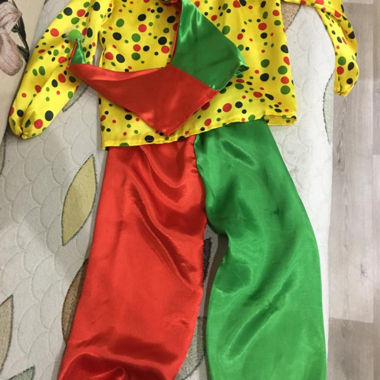 На штаны тоже нашиваются цветные заплатки (чем жизнерадостнее цветовая гамма, тем более удачным карнавальный костюм получится).