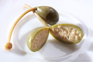 Впрочем, помимо бутонов аналогичным образом засаливают и плоды каперсов, ягоды, которые вырастают, если дать бутонам отцвести, и внешне напоминают зеленые оливки с длинным хвостиком. Внутри такие каперсы имеют нежно-розовую мякоть и множество светлых косточек: они съедаются целиком, но косточки могут быть довольно жесткими, что, полагаю, и обусловило им судьбу продукта на любителя, в отличие от тех же бутонов.