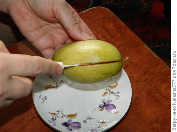 Спустя 20 дней один из плодиков был готов к употреблению. Такой ароматный запах носился в воздухе, что захотелось его разрезать. УРА!!! Все получилось…вкусный и сочный фрукт ПЕПИНО!!!!