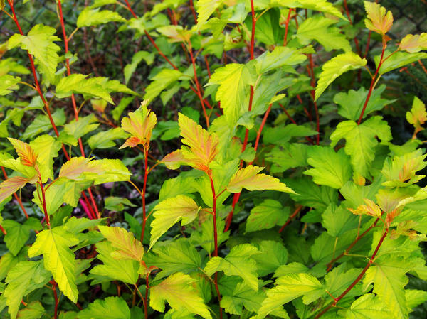 - – пузыреплодник калинолистный Лютеус – быстрорастущий кустарник высотой до 3 м с белыми цветками, желтыми с оранжевым оттенком листьями, которые летом становятся чуть зеленее;