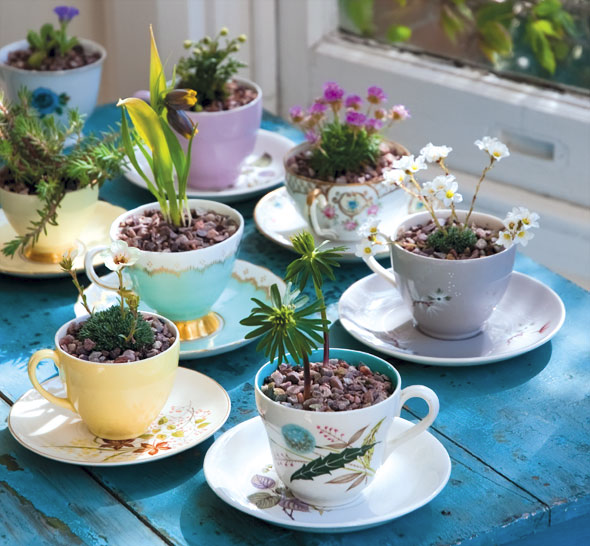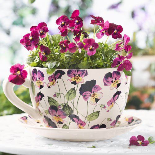 В чашку можно посадить и цветущее растение. Кстати, получится симпатичный подарок!