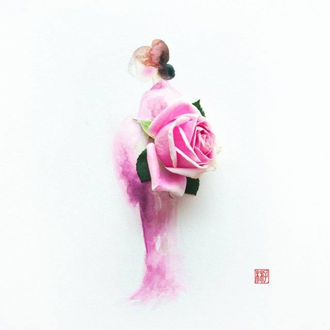 Идея создания последней и, пожалуй, самой прекрасной серии фотоиллюстраций – акварельных рисунков с добавлением живых цветов – пришла к художнице, когда она размышляла над подарком для своей бабушки. Лим прикрепила несколько лепестков роз к книжной закладке, сделав из них платья для нарисованной девушки. Тогда и началась цветочная история, над которой талантливая мастерица продолжает активно работать.