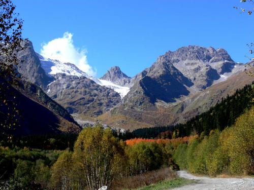 Мягкий и достаточно теплый климат привлекает сюда туристов на протяжении всего года. Средняя температура зимой составляет всего -5°С на равнине и до -10°С высоко в горах. К примеру, на горном курорте Домбай мороз и вовсе «не кусается» - чаще всего температура опускается всего до -3°С, а во время оттепели столбик термометра может подняться выше +15°С. Снега здесь выпадает достаточно много. В середине довольно продолжительного лета воздух обычно прогревается до +20°С, иногда до +29°С и даже до +39°С в низинах и до +8°С на высокогорье. Обилие осадков наблюдается в этом регионе круглый год.