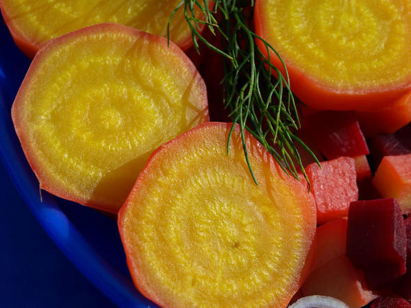 Если желтые, оранжевые и красные овощи перекрашиваются в модный фиолетовый, то эта свекла в пику им осветлилась и стала «блондинкой». Вкус при этом сохранился настоящий, свекольный. Очень удобно добавлять ее в те блюда, которые должны сохранить цвет, а не окраситься в однородно-свекольный.