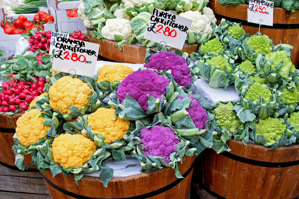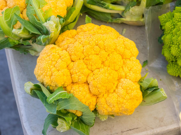 Форма этого овоща осталась привычной, а вот цвет претерпел сильные изменения. Были выведены фиолетовый и желтый сорта цветной капусты. Знакомые блюда станут нарядными и модными с таким ингредиентом. Да и в саду смотреться она будет великолепно. Цветная капуста содержит достаточное количество витамина С, а фиолетовая разновидность богата еще и антоцианином, который помогает нашим сосудам избежать тромбов и улучшает работу сердца.