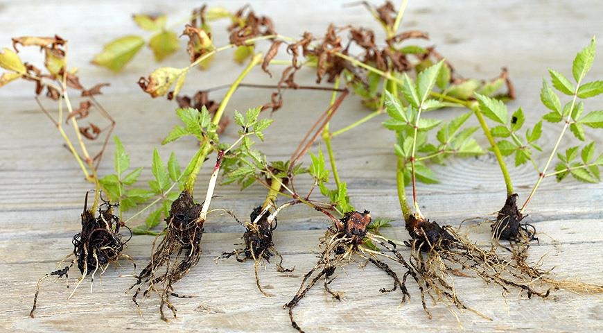 Садовыми вилами выкопайте и осторожно поднимите растение, стараясь не сломать длинный стержневой корень.