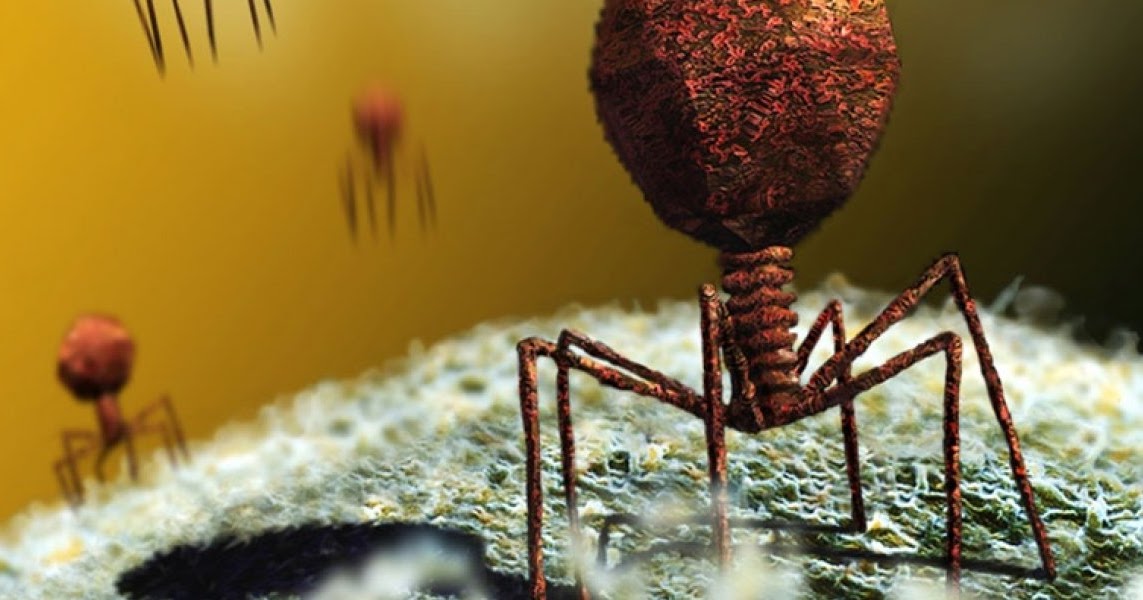 Рис. 1. Бактериофаги, прикрепленные к клетке-хозяину (электронная микрофотография). У бактериофага с хвостами, подобного показанному здесь, хвосты служат проходом для передачи генома фага. (кредит: модификация работы доктора Грэма Бердса; данные масштабной линейки от Мэтта Рассела)